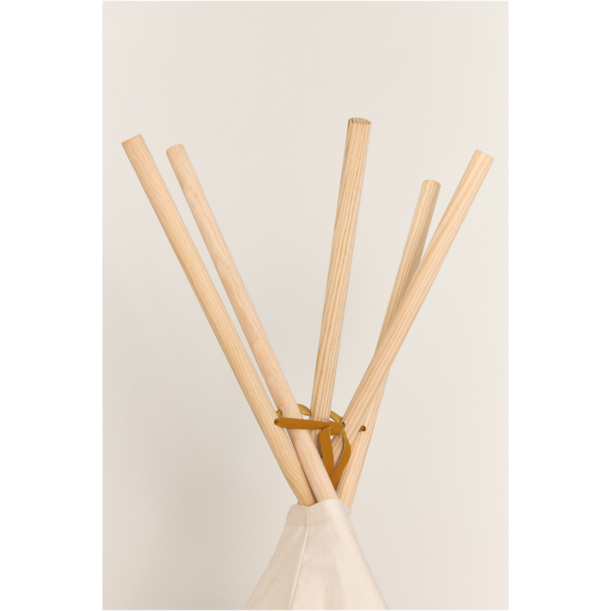 Dankzij de vijf stevige grenenhouten stokken staat de tipi stabiel en veilig. De opbouw is eenvoudig: schuif de stokken in de stoffen tunnels en bind ze bovenaan samen met het koord.
