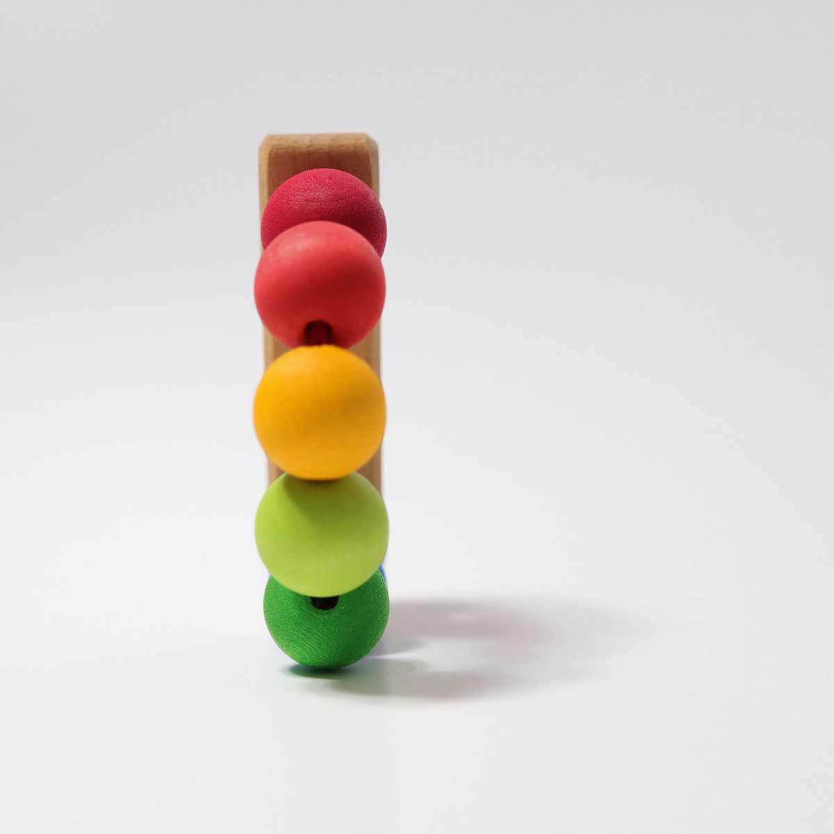 - Afmetingen: Het grijpspeeltje heeft een diameter van 9 cm, met houten kralen die 2 cm in diameter meten.
