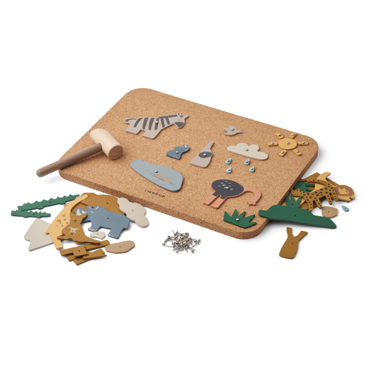 Met het Liewood Esteban Hammerspel kan je kind zijn of haar creativiteit de vrije loop laten. De verschillende dieren en vormen kunnen steeds opnieuw op het kurkbord worden gerangschikt, zodat er telkens weer nieuwe, spannende werelden ontstaan. Dit spel bevordert niet alleen de fijne motoriek, maar prikkelt ook de verbeelding en zorgt voor uren speelplezier.