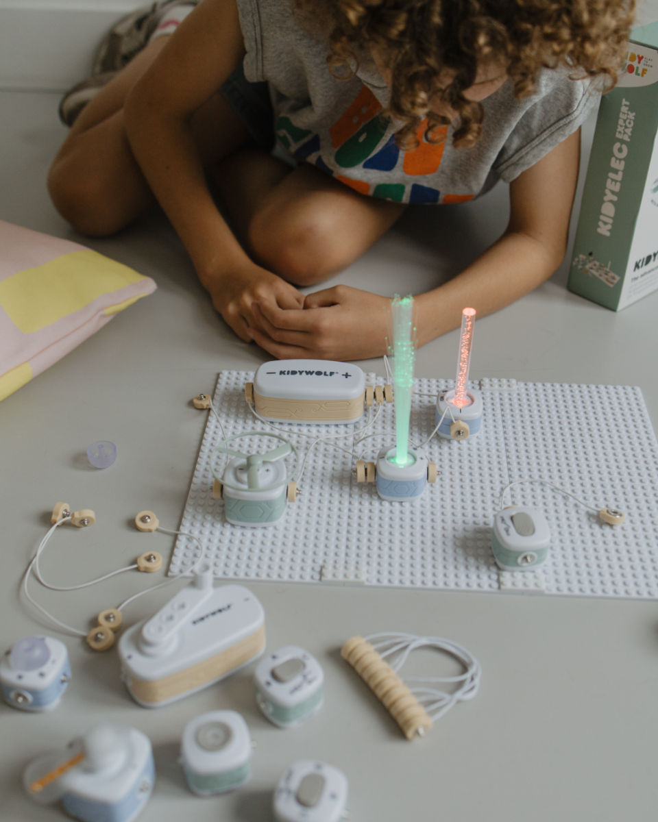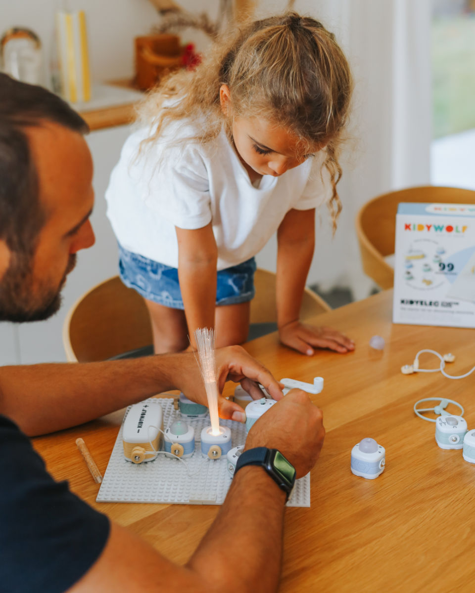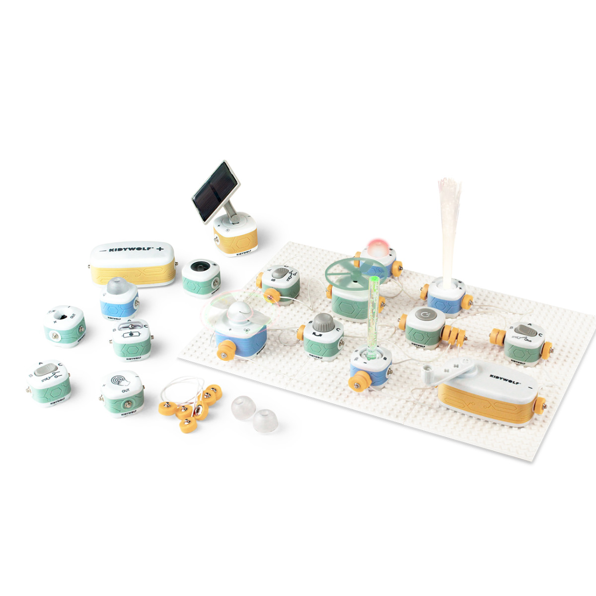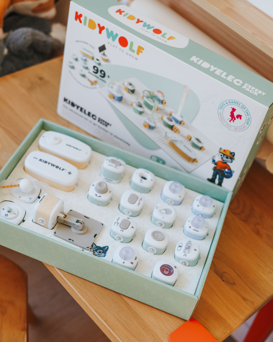 Met het Kidywolf Kidyelec-Pro Expert Set wordt elektriciteit een spannend avontuur. Kinderen vanaf 8 jaar bouwen hun eigen schakelingen, verbinden blokken en zien hoe lampjes branden of propellers draaien. Zo verandert nieuwsgierigheid in kennis – praktisch, leerzaam en leuk.