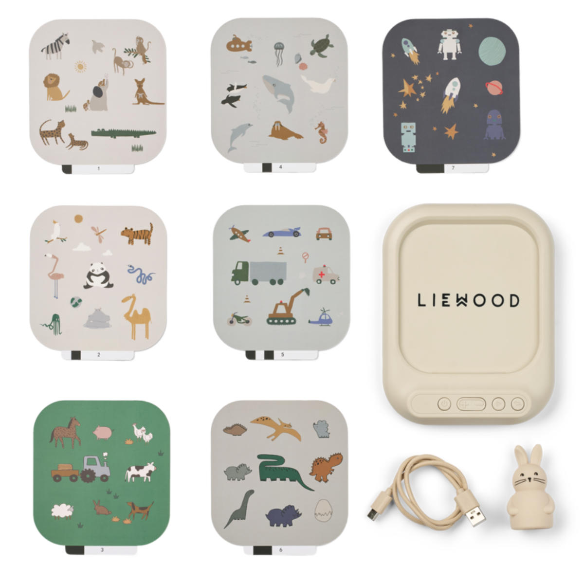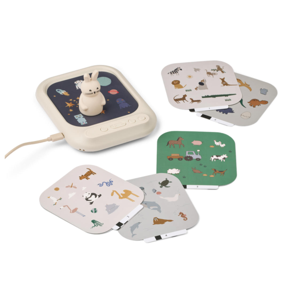 Door een themakaart in het soundboard te plaatsen verandert het speelveld in een nieuwe omgeving, zoals een boerderij, een bos of zelfs de ruimte. Wanneer kinderen het siliconen konijntje op een icoon plaatsen, horen ze het bijpassende geluid.