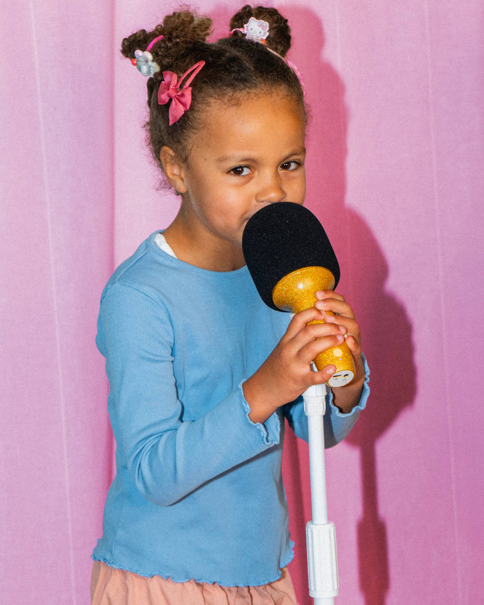 De driepootbasis zorgt voor stabiliteit, zelfs wanneer enthousiasme in dansbewegingen verandert. Zo blijft de microfoon stevig staan en kan je kind vrij en vol zelfvertrouwen optreden.