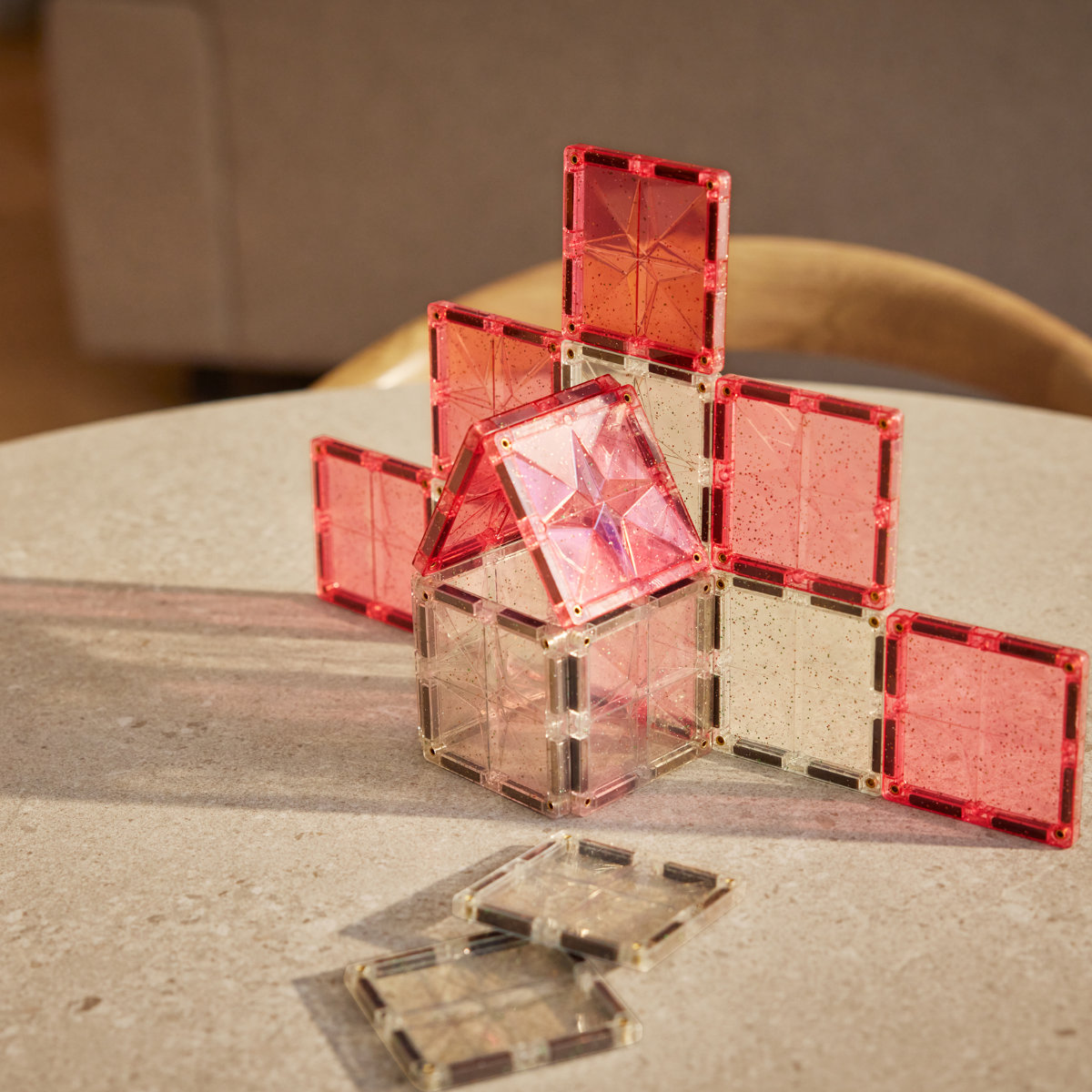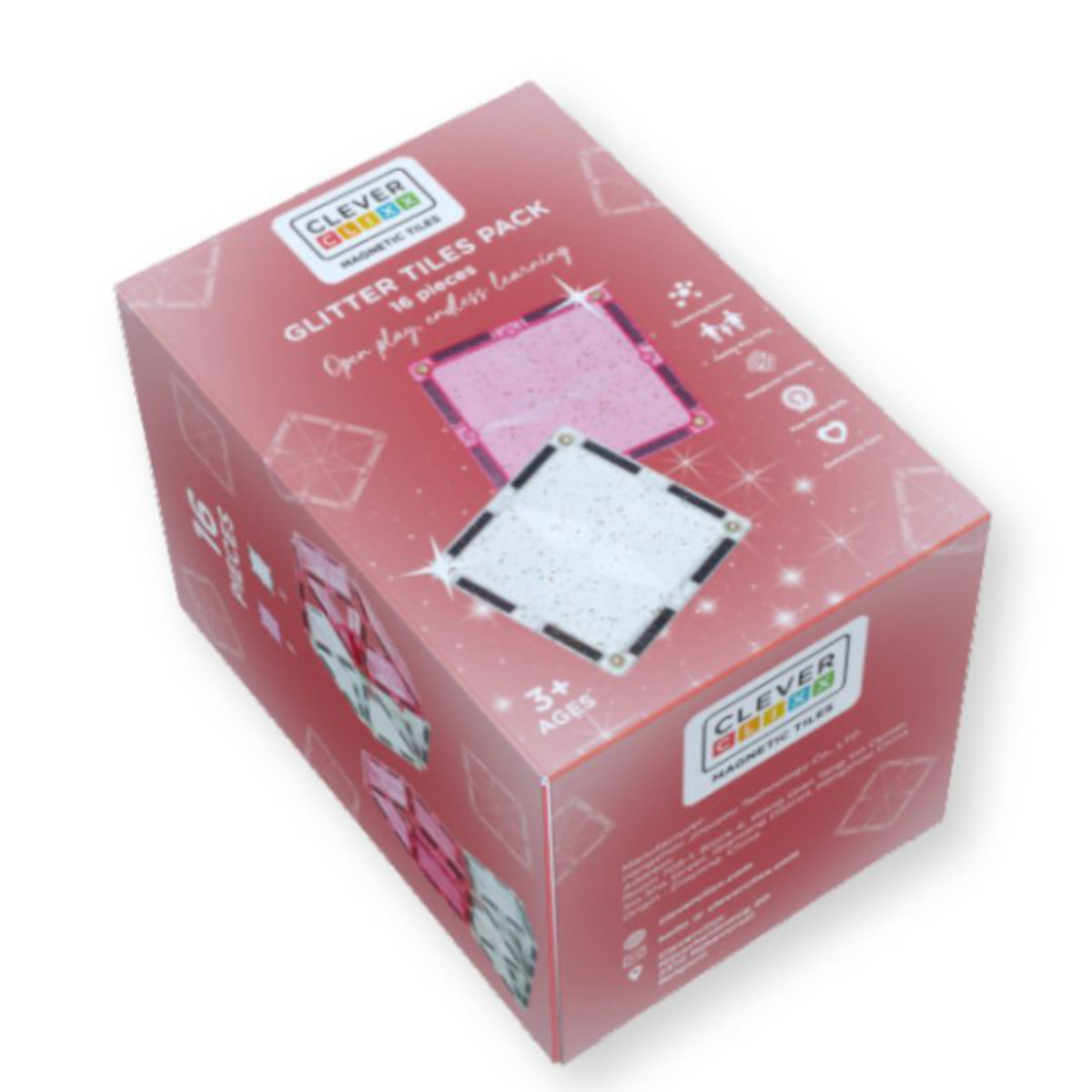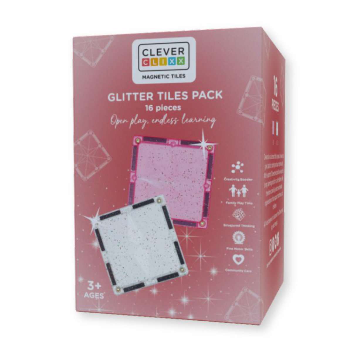 Het Glitter Tiles Pack sluit naadloos aan op alle andere Cleverclixx sets – van knallende kleuren tot pastelcollecties en zelfs knikkerbanen. Bovendien is het compatibel met de meeste andere magnetische tegelmerken, zodat kinderen nog grotere bouwwerken kunnen maken.