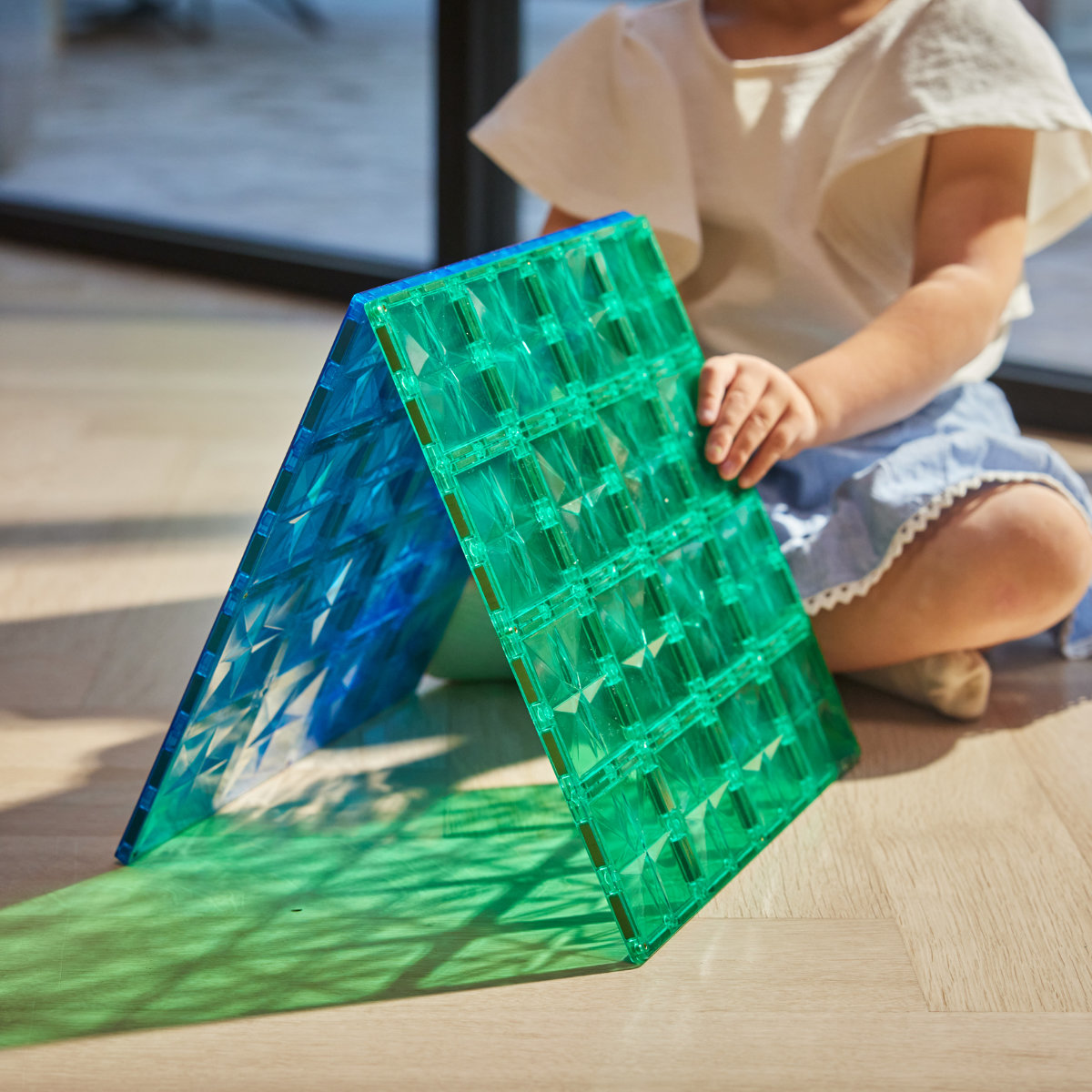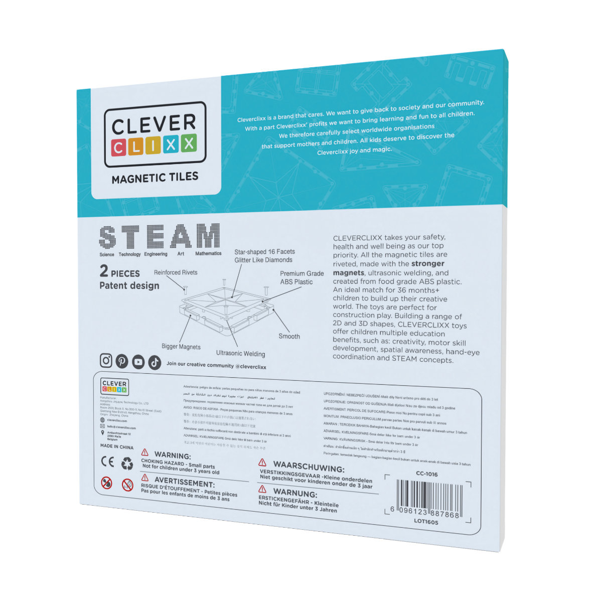 De Cleverclixx Grote Basisplaten zijn volledig compatibel met Connetix en Magna-Tiles. Dit betekent dat je kind sets kan combineren en eindeloos kan variëren in bouwen.