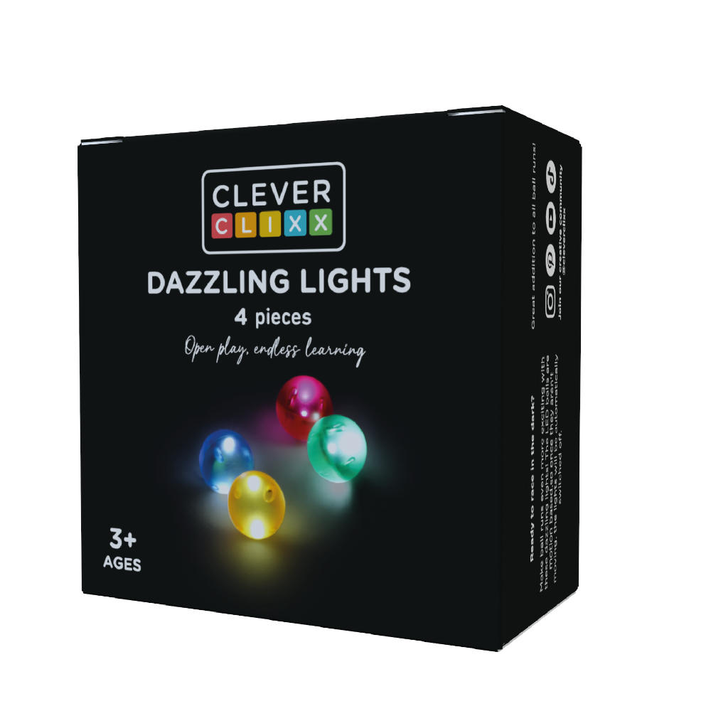 De Cleverclixx Lichteffect Kogelset – 4 stuks tilt het spelen met knikkerbanen naar een hoger niveau. Ze stimuleren creativiteit, motorische ontwikkeling en probleemoplossend vermogen, en voegen daarbij een spectaculaire lichtshow toe. Een must-have uitbreiding voor iedere jonge bouwer die houdt van extra magie in zijn of haar knikkerbaan!