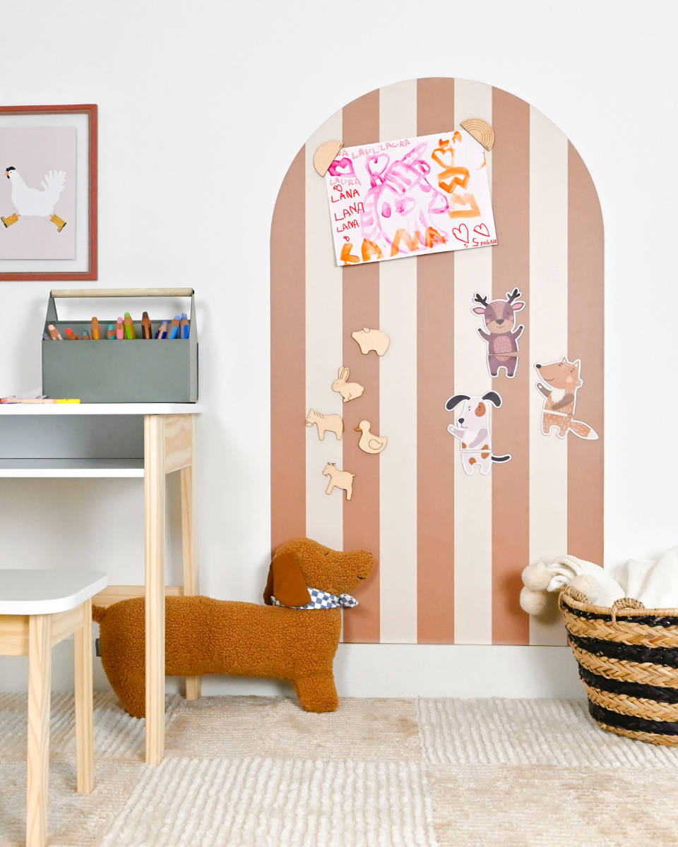 Het bord kan op elke gladde ondergrond worden aangebracht: muren, deuren of meubels. De zwarte basis heeft een herpositioneerbare kleeflaag, zodat je het voorzichtig kunt loshalen en elders opnieuw kunt bevestigen. De gekleurde cover wordt eenvoudig erbovenop geplaatst voor een nette en decoratieve afwerking.