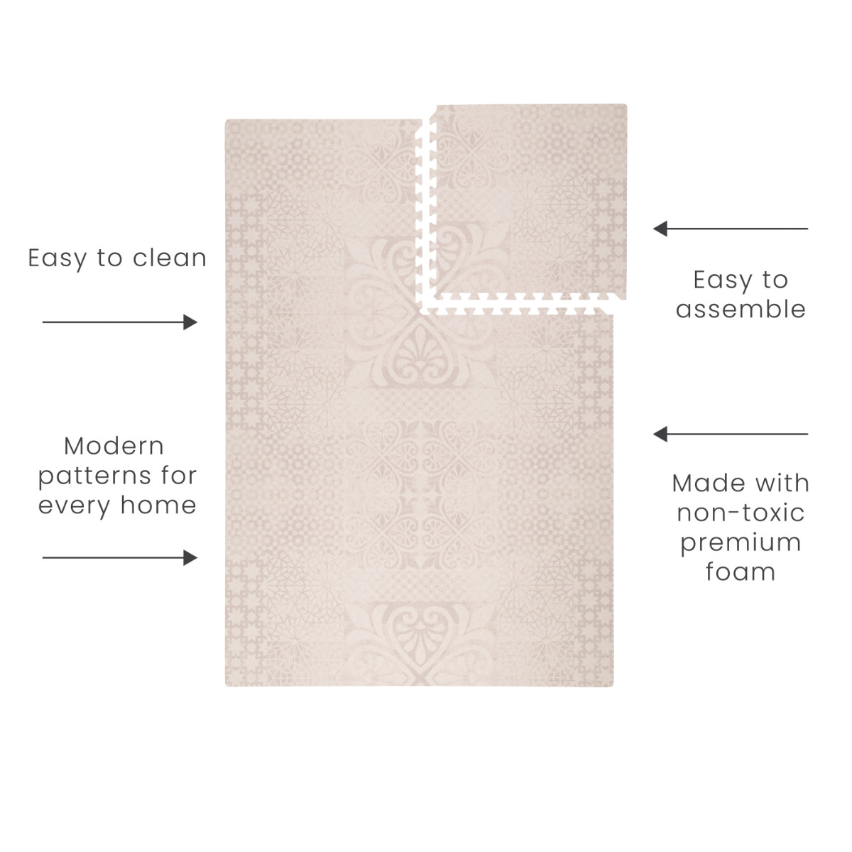 Het Toddlekind Speeltapijt in Perzisch design bestaat uit zes tegels van 60 x 60 cm die naadloos in elkaar gezet kunnen worden. Om de juiste maat voor jouw kamer en huis te vinden, kan je meerdere matten bij elkaar leggen en ze met elkaar combineren. De maatcombinaties zijn eindeloos.