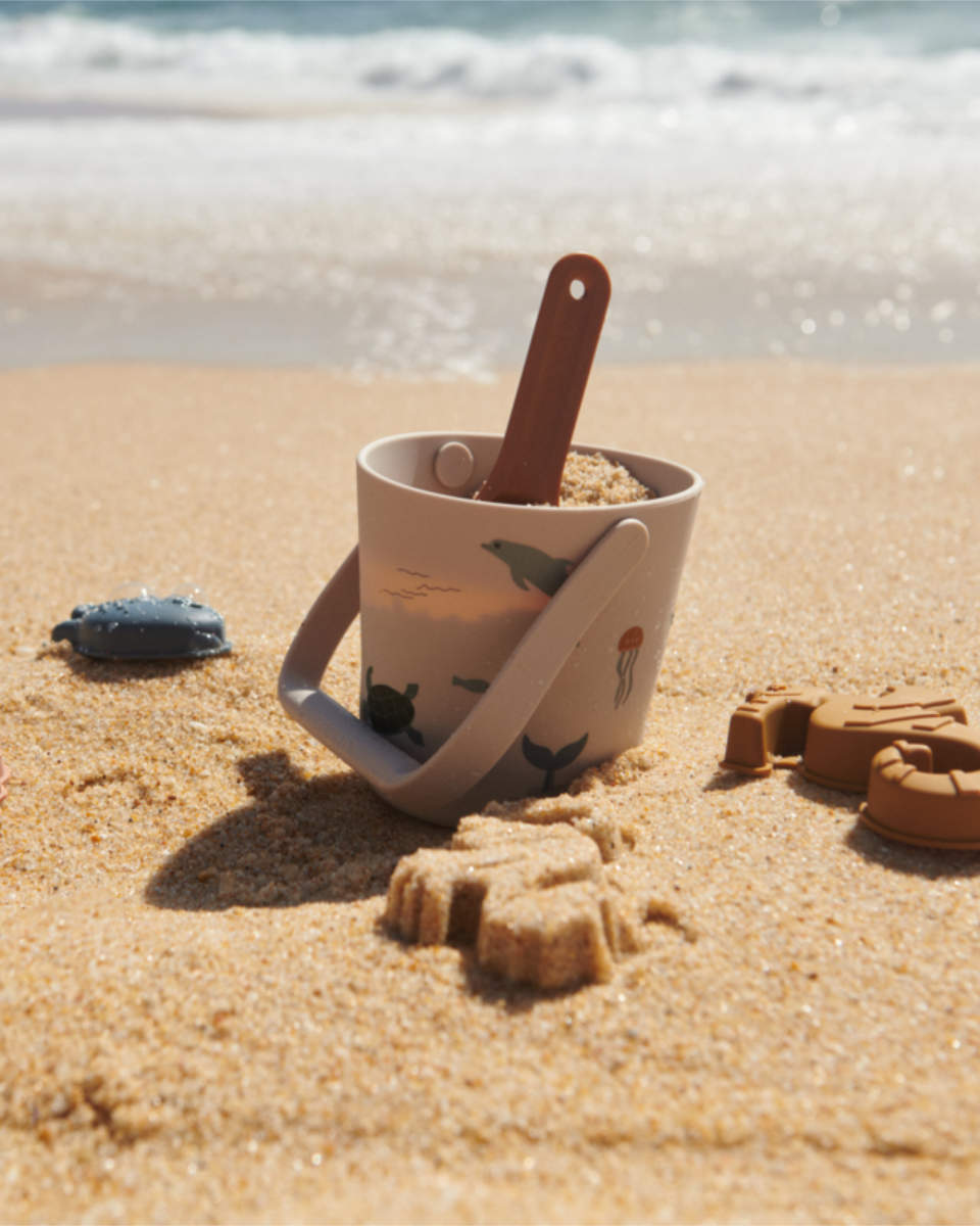 De set bestaat uit een zachte siliconen emmer, een schep en vier zandvormpjes. Samen zorgen ze voor eindeloos speelplezier aan zee, in de tuin of bij het zwembad.