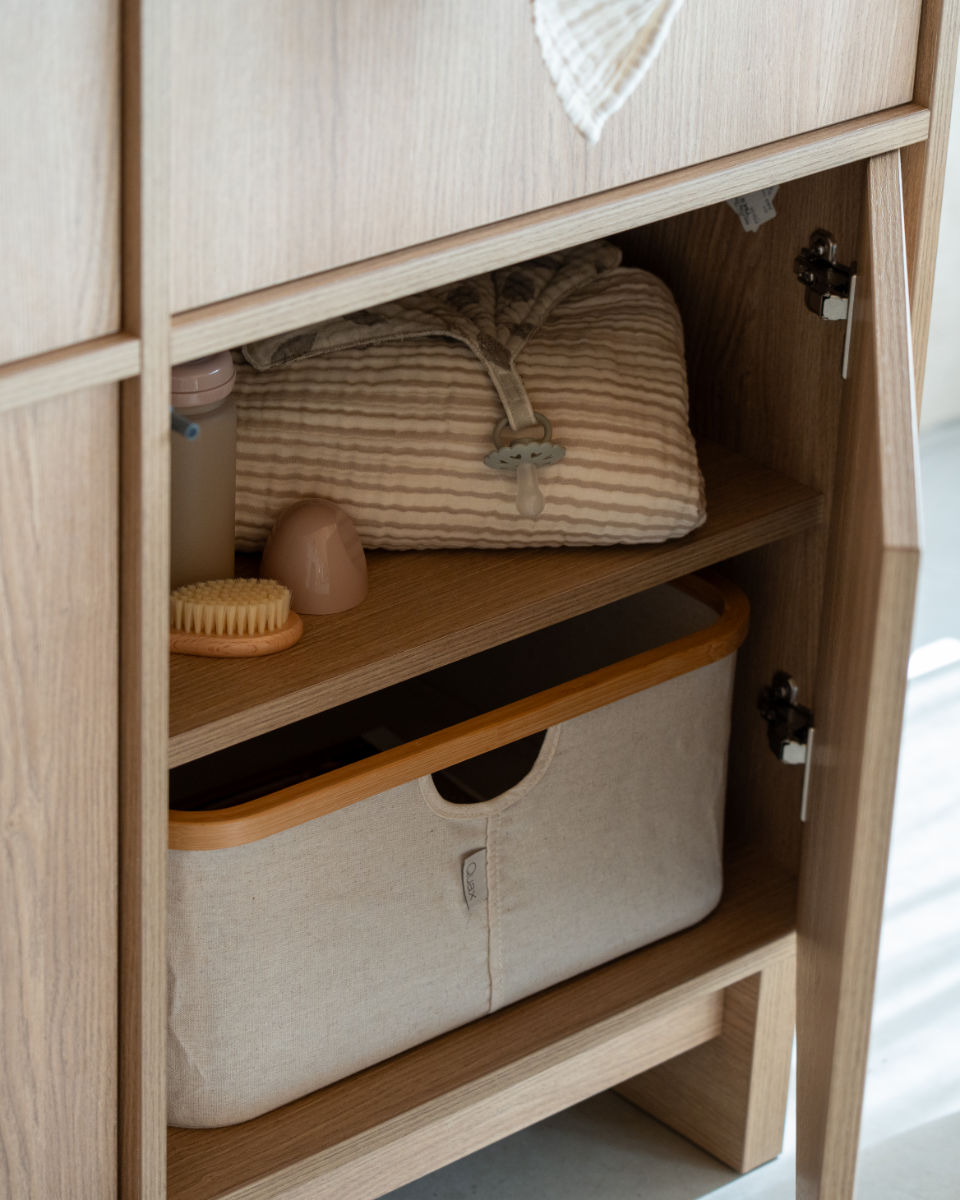 Met de Quax Kyo Mand breng je extra structuur en rust in de kinderkamer. De mand is perfect afgestemd op de Kyo commode en de Kyo kleerkast en vult hun warme, minimalistische uitstraling prachtig aan. Ideaal om kleine spullen netjes op te bergen – zonder rommel.