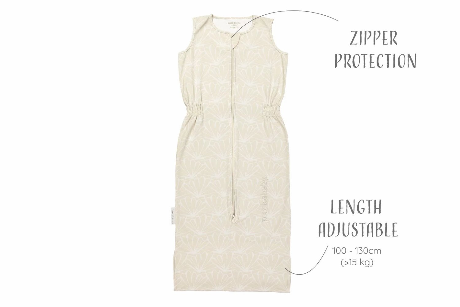 Dankzij de lengteverstelling van 100 cm tot 130 cm heeft de Puckababy kinderslaapzak een lange levensduur, namelijk van 2,5 jaar tot minstens 7 jaar. De kinderslaapzak vernauwt niet en zit losjes en comfortabel. Deze slaapzak heeft geen mouwen om warmtestuwing te voorkomen, aangezien de meeste kinderen er een pyjama onder aan hebben.