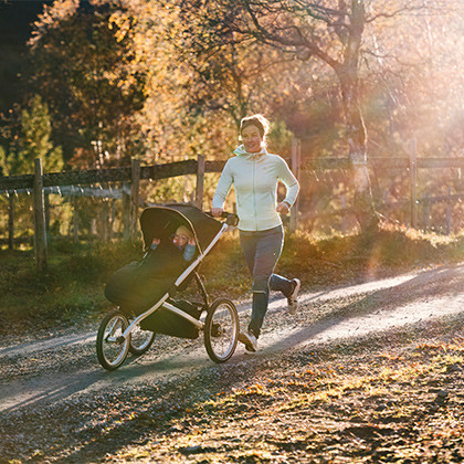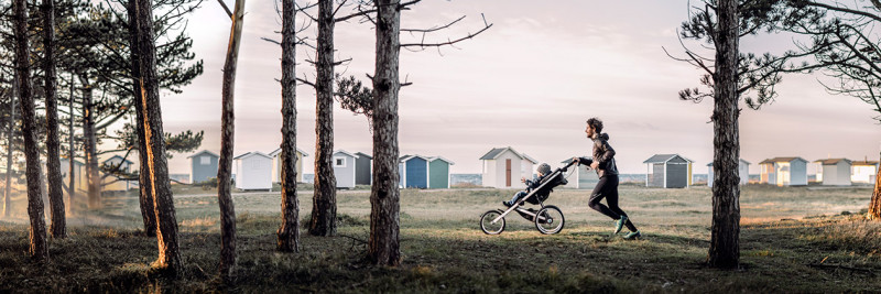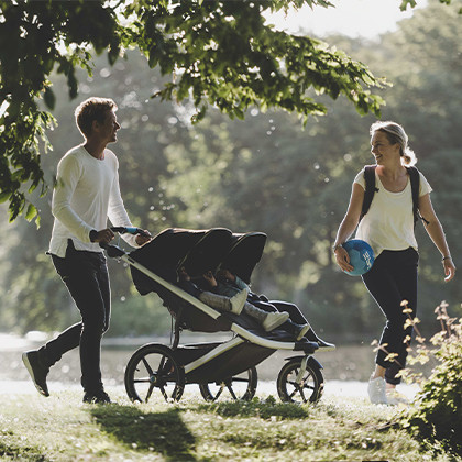 De Thule kinderwagens laten zich gemakkelijk manouvreren op oneffen terrein. De Thule Urban Glide2, Thule Glide2 Jet, Thule Sleek en de Thule Urban Double2 kunnen vanaf de geboorte gebruikt worden door middel van een Thule reiswieg.
