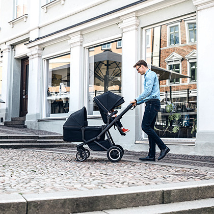 Als je aan een meer klassieke kinderwagen denkt, denk je aan een kinderwagen met 4 wielen. Hier is Thule op ingesprongen en heeft hiervoor de Thule Sleek ontworpen. De Thule Sleek is te gebruiken vanaf de geboorte tot en met circa 4 jaar. Maar dit is nog niet het enige. De Thule Sleek kan je ook uitbouwen als tweeling kinderwagen of duo kinderwagen door middel van de bijpassende adapters. Het grote voordeel hiervan is, is dat als je zwanger bent van je eerste kindje en er iets later een tweede kindje komt, je niet een nieuwe kinderwagen hoeft te kopen. Met de uitbreidingsset van een extra reiswieg of extra sportstoeltje kan je de kinderwagen ombouwen en op die manier langer gebruiken. De Thule beschikt over 4 grote profielwielen. De voorste wielen, kan je fixeren, zodat je ook in de sneeuw en over oneffen terreing goed kan wandelen.
