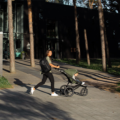 De Thule kinderwagens laten zich gemakkelijk manouvreren op oneffen terrein. De Thule Urban Glide 2, Thule Glide2 Jet, Thule Sleek en de Thule Urban Double2 kunnen vanaf de geboorte gebruikt worden door middel van een Thule reiswieg.