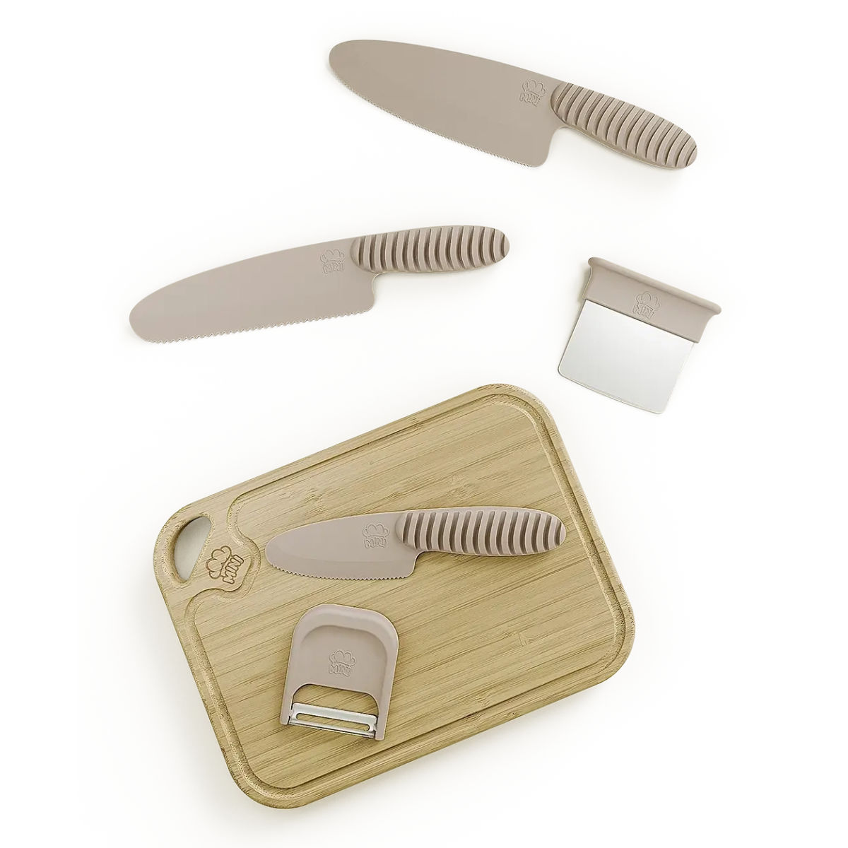 Deze complete set bevat een kindermes, een dunschiller, een hakmes en een stevige snijplank. Geen speelgoed, maar echte keukenhulpmiddelen die speciaal zijn ontworpen voor kleine handen.